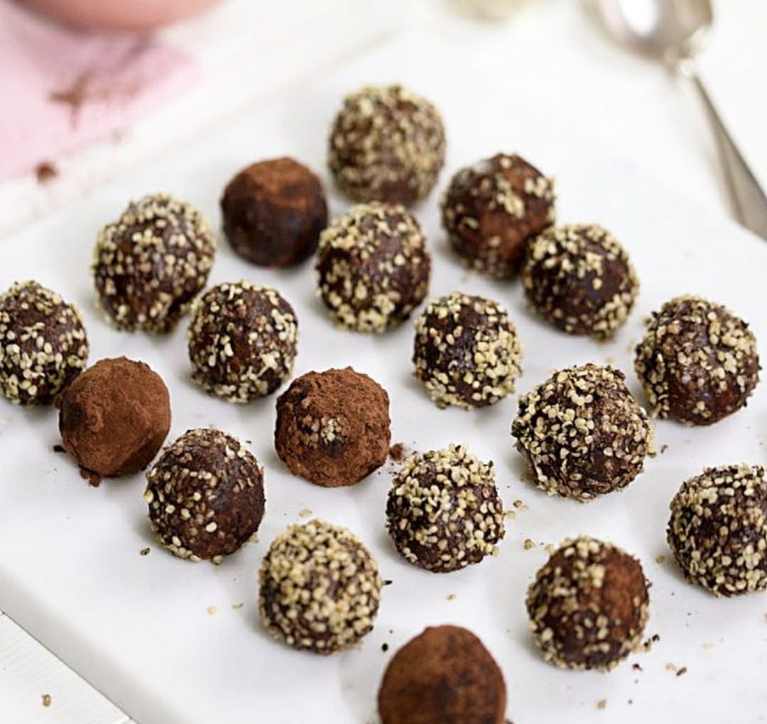 - 8Formare delle praline su una superficie liscia e spolverarle con cacao e semi di canapa.