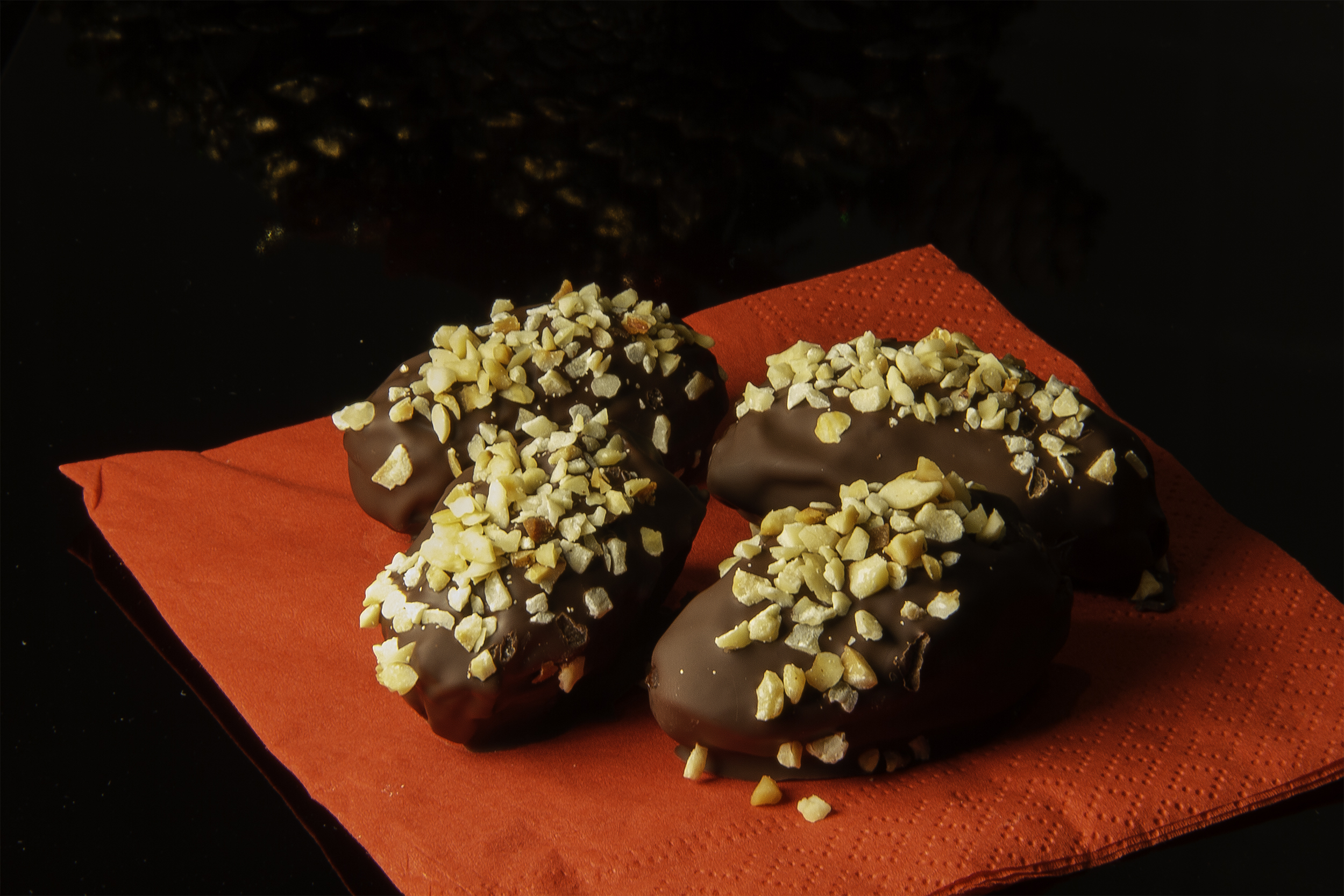 - 3Una volta sciolto il cioccolato fondente farcire i datteri con 2 mandorle ciascuno e richiuderli accuratamente.