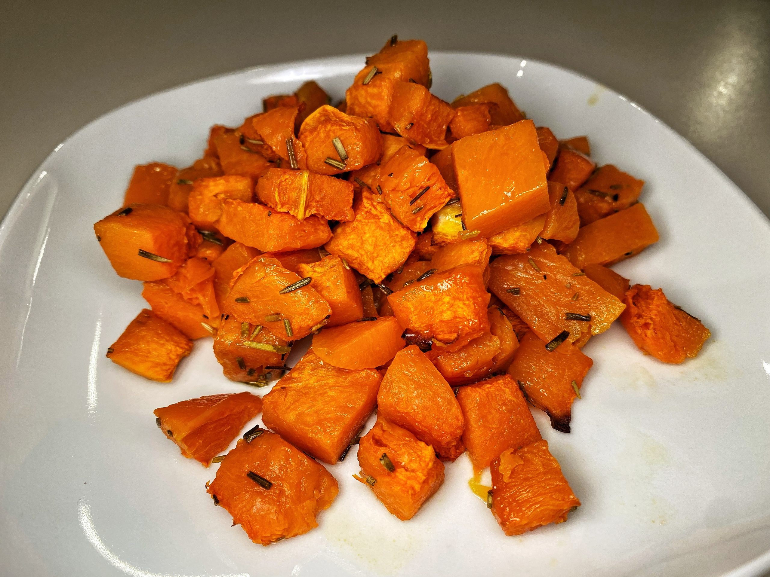 - 4Condire la zucca con i due spicchi di aglio, sale, olio extravergine di oliva e rosmarino.