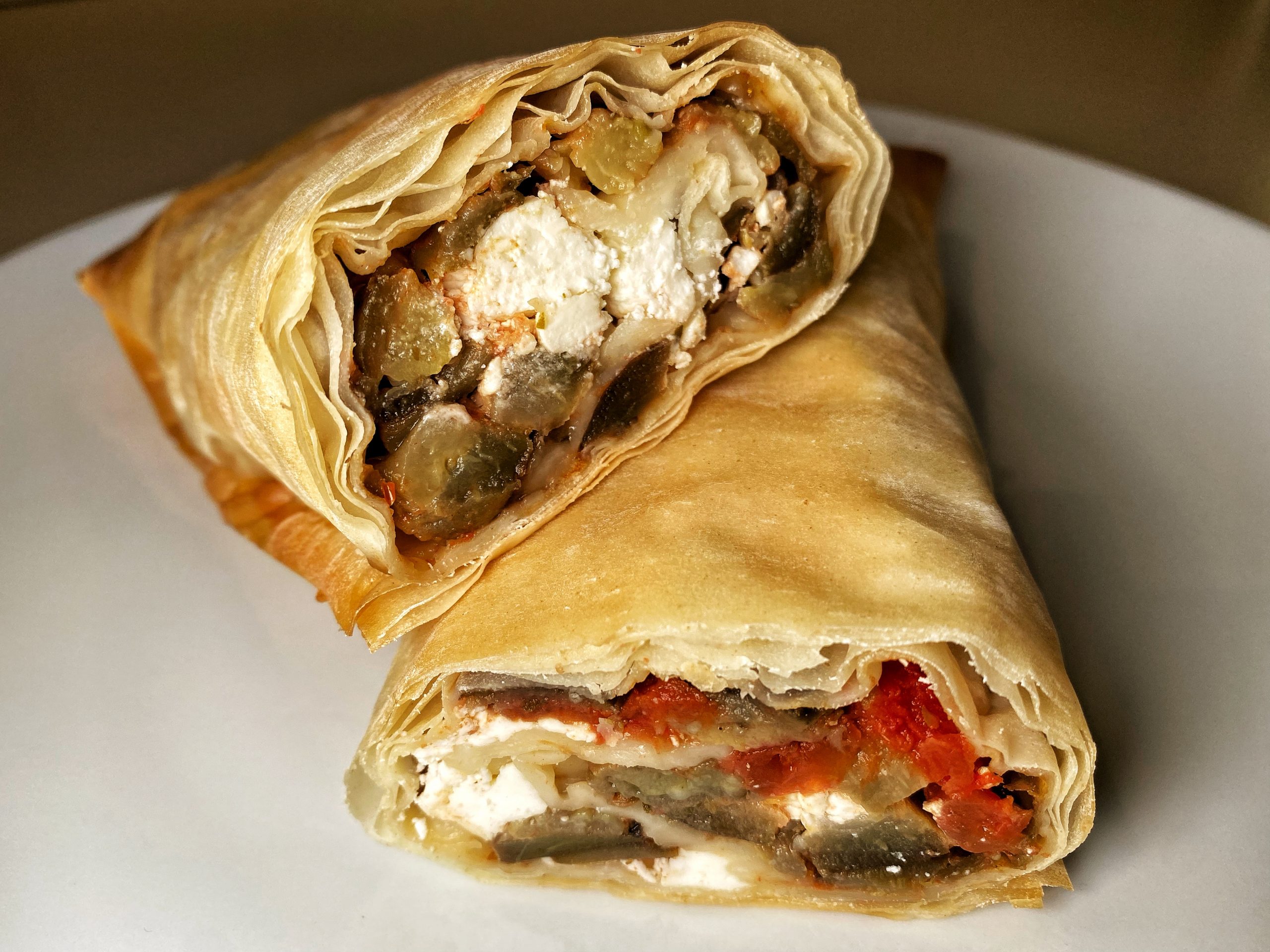 - 7Porre le melanzane e i pomodorini su metà foglio di pasta fillo, aggiungere la feta a cubetti e avvolgere formando uno strudel e richiudendo le estremità laterali per avitare la fuoriuscita degli ingredienti.