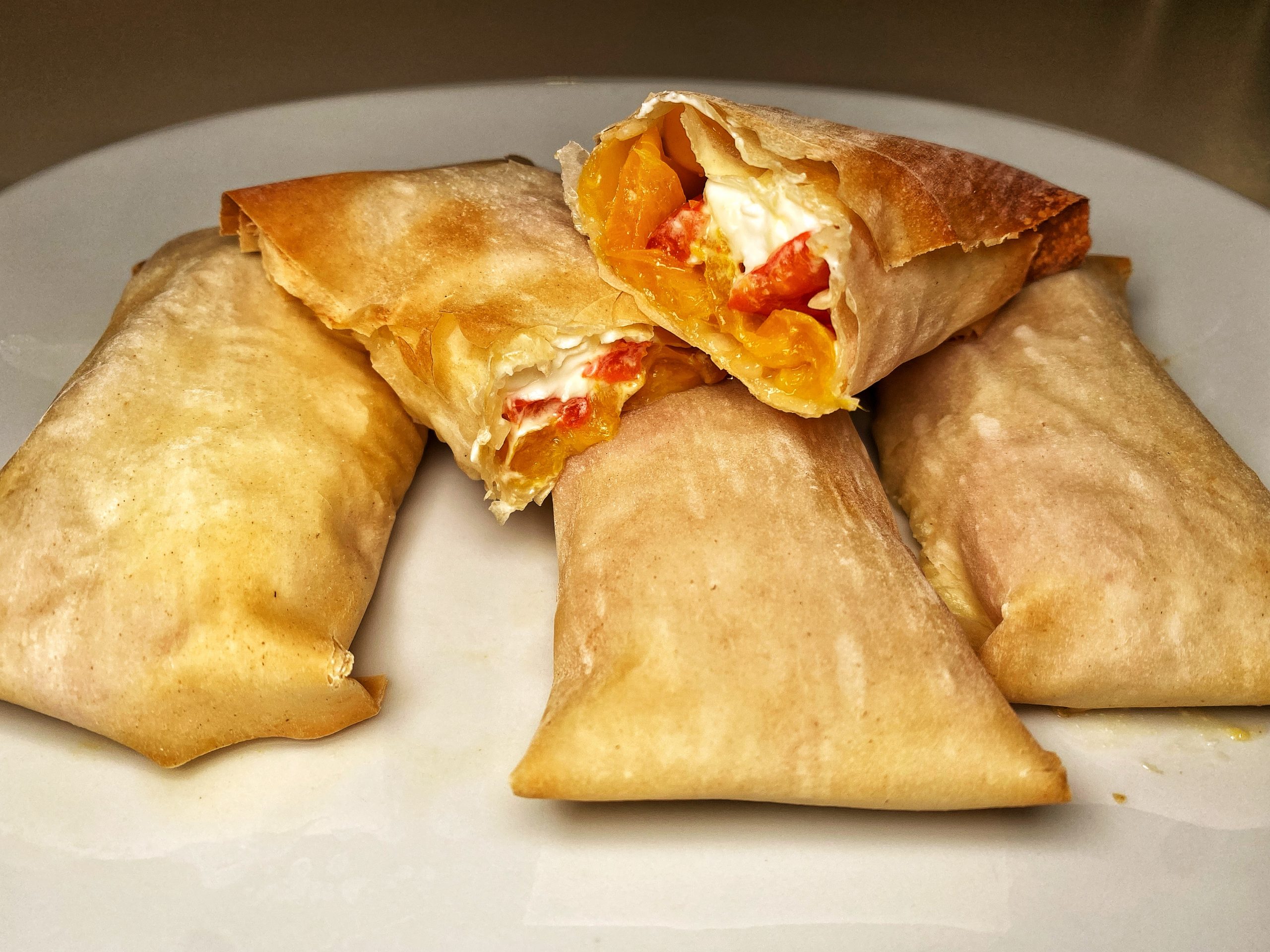- 2Aggiungere i peperoni precedentemente cotti in padella con solo sale e tagliati a tocchetti sulle estremità delle strisce di pasta fillo.