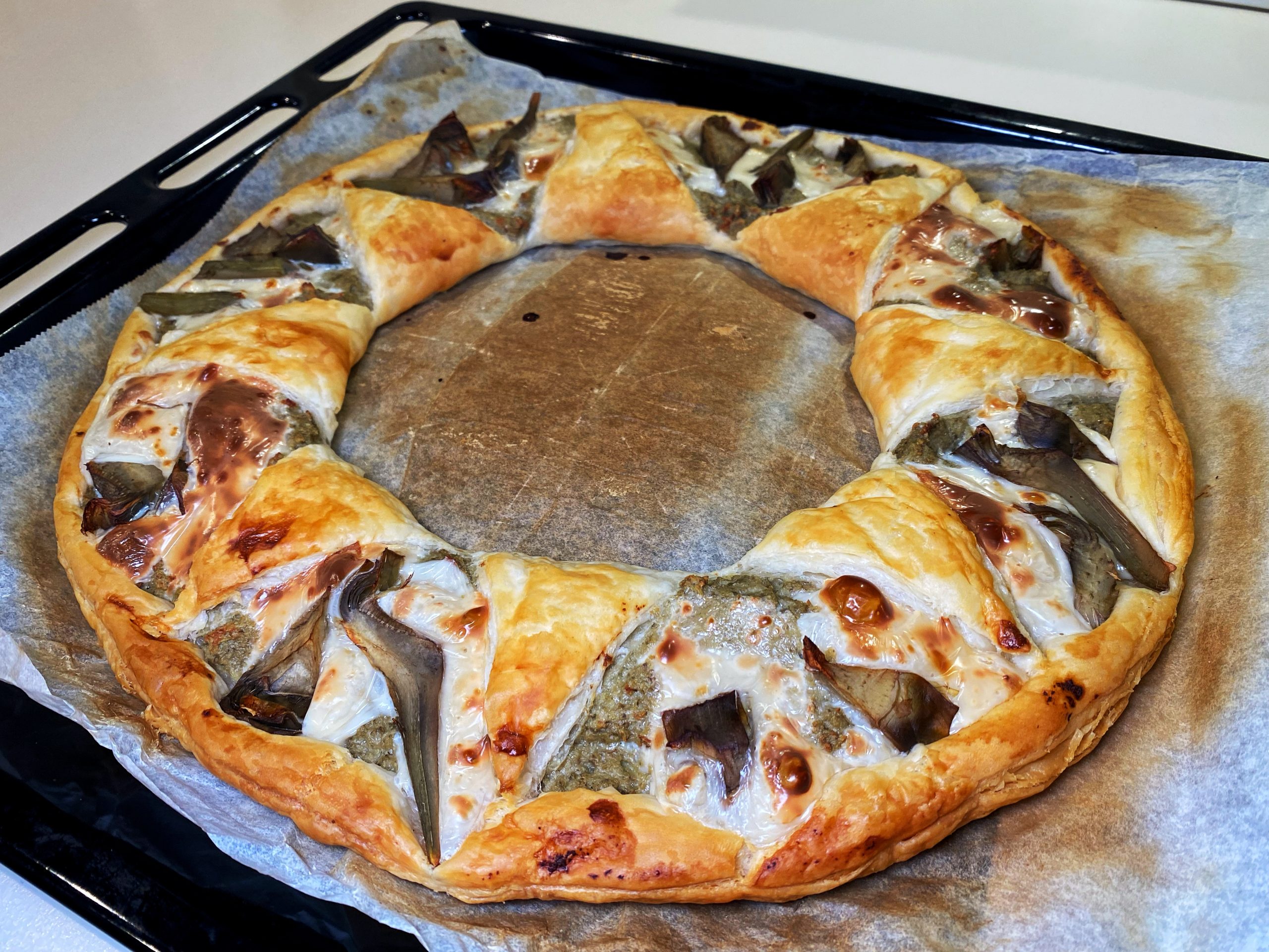 - 12Porre nella parte non ricoperta di sfoglia gli spicchi di carciofo tenuti da parte.