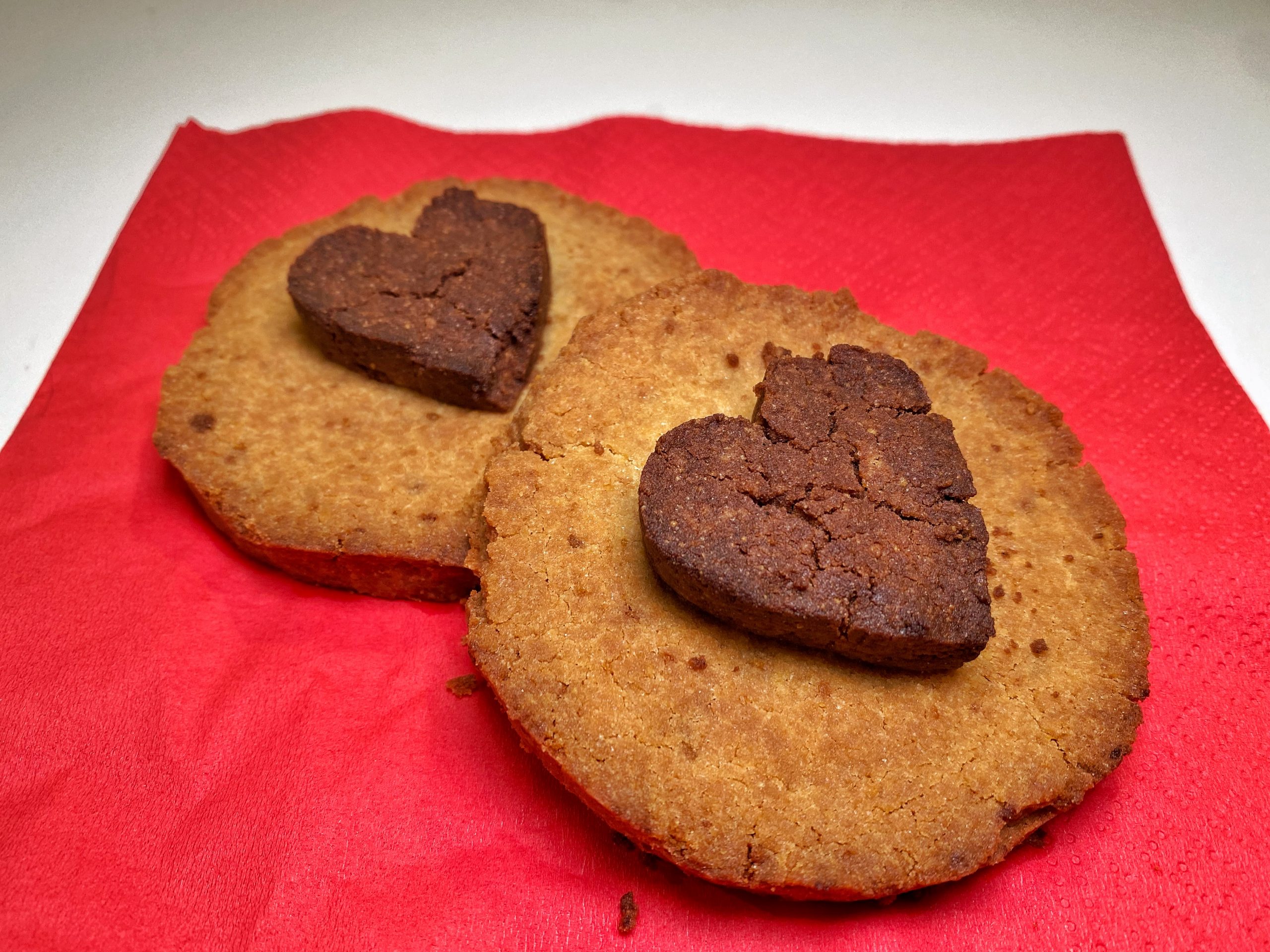 - 5Formare dei cuoricini piccoli con l’impasto al cacao aiutandosi con delle formine a cuore e disporli al centro dei biscotti tondi.