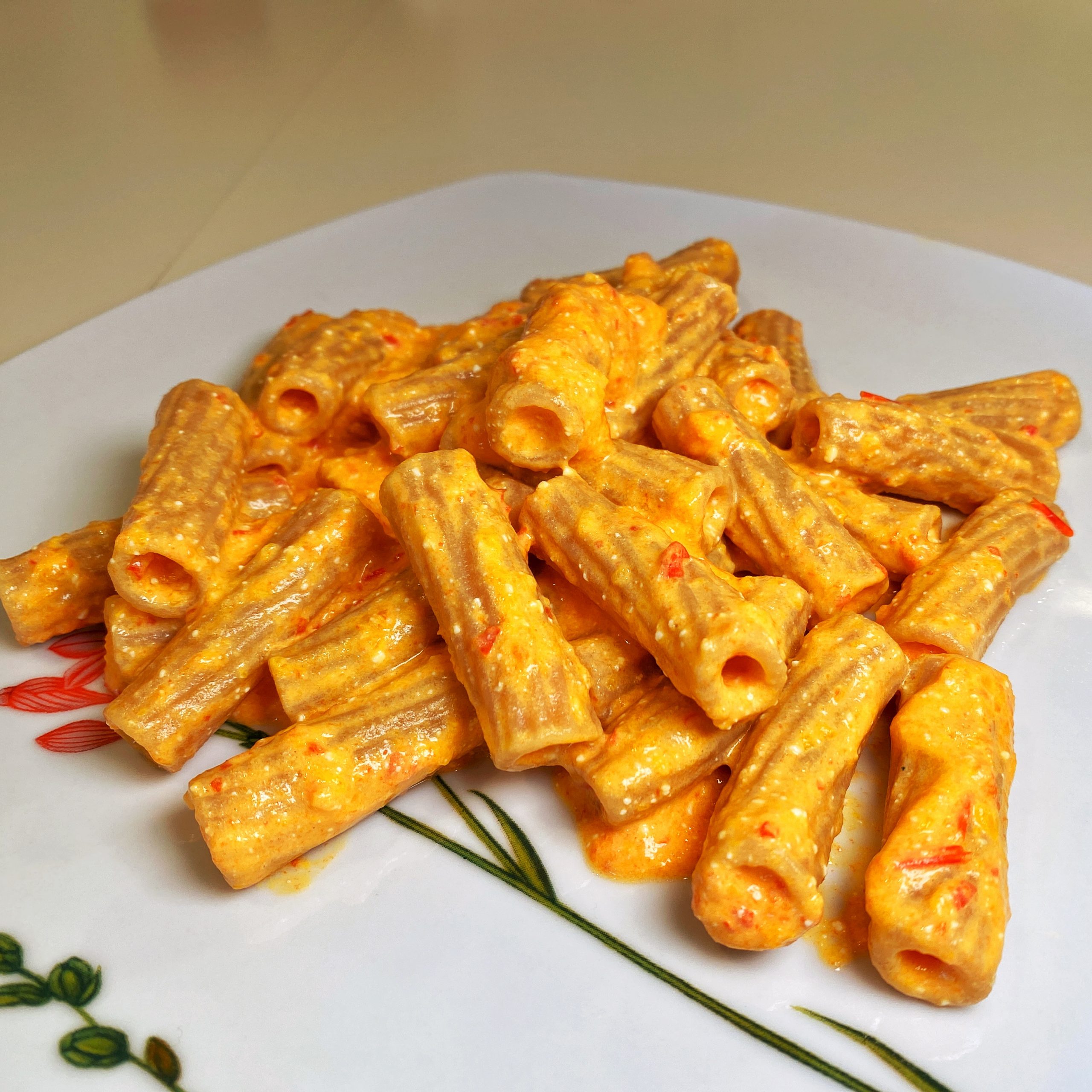 • 6Versare la crema di peperoni in una padella, scolare la pasta integrale ed aggiungerla alla crema.