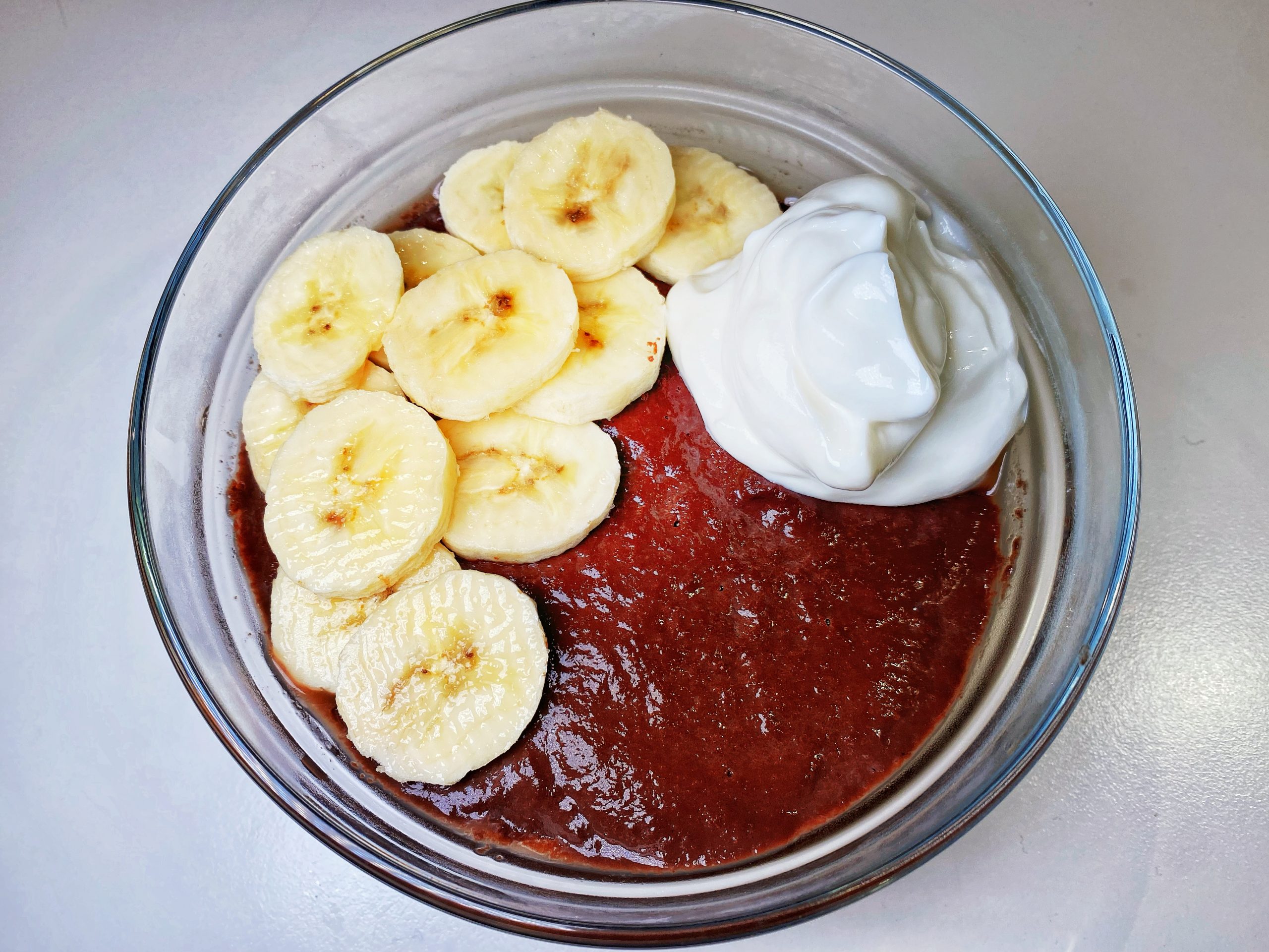 - 5Guarnire secondo gradimento (io l'ho guarnito con yogurt greco e banana) e gustare!