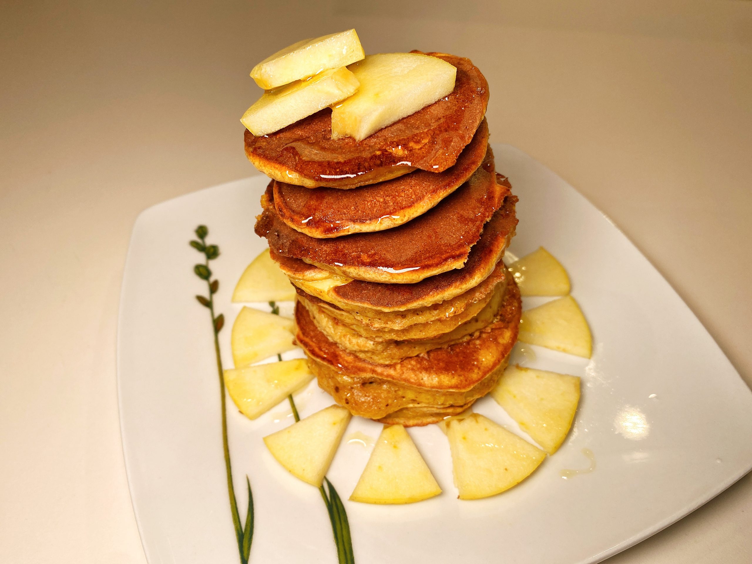 - 9Tagliare a triangolini la restante mela, impiattare i pancakes e guarnirli con i triangolini di mela e il miele.