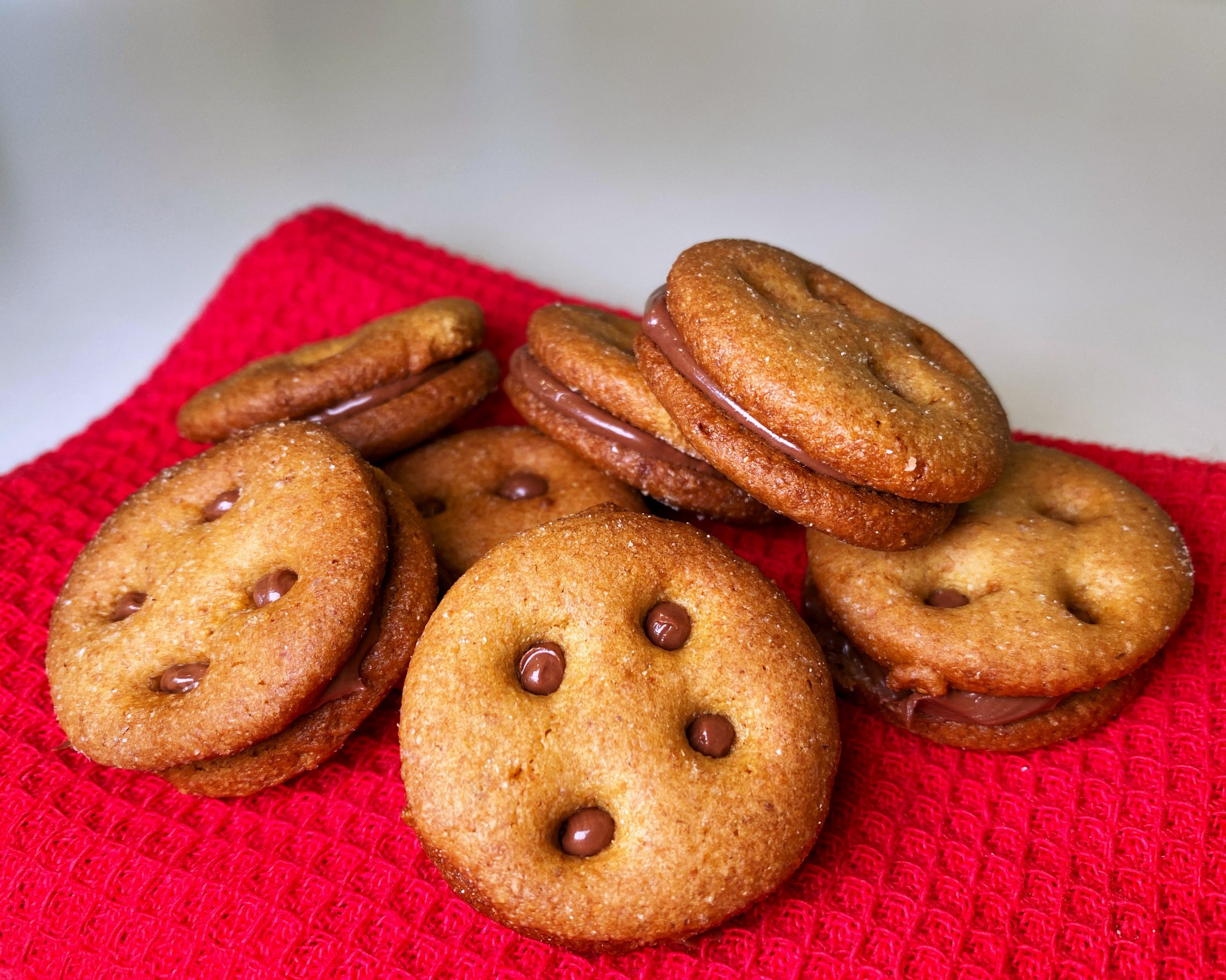- 7Lasciar raffreddare i biscottini, farcirli con crema di nocciola bio e servirli!