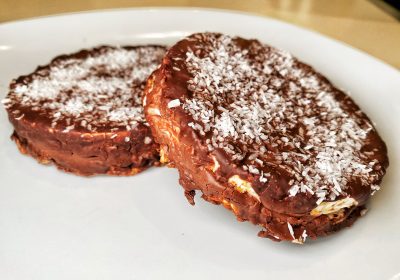 - 2Immergere un'altra fetta biscottata nel latte scremato e porre sopra quella precedente.