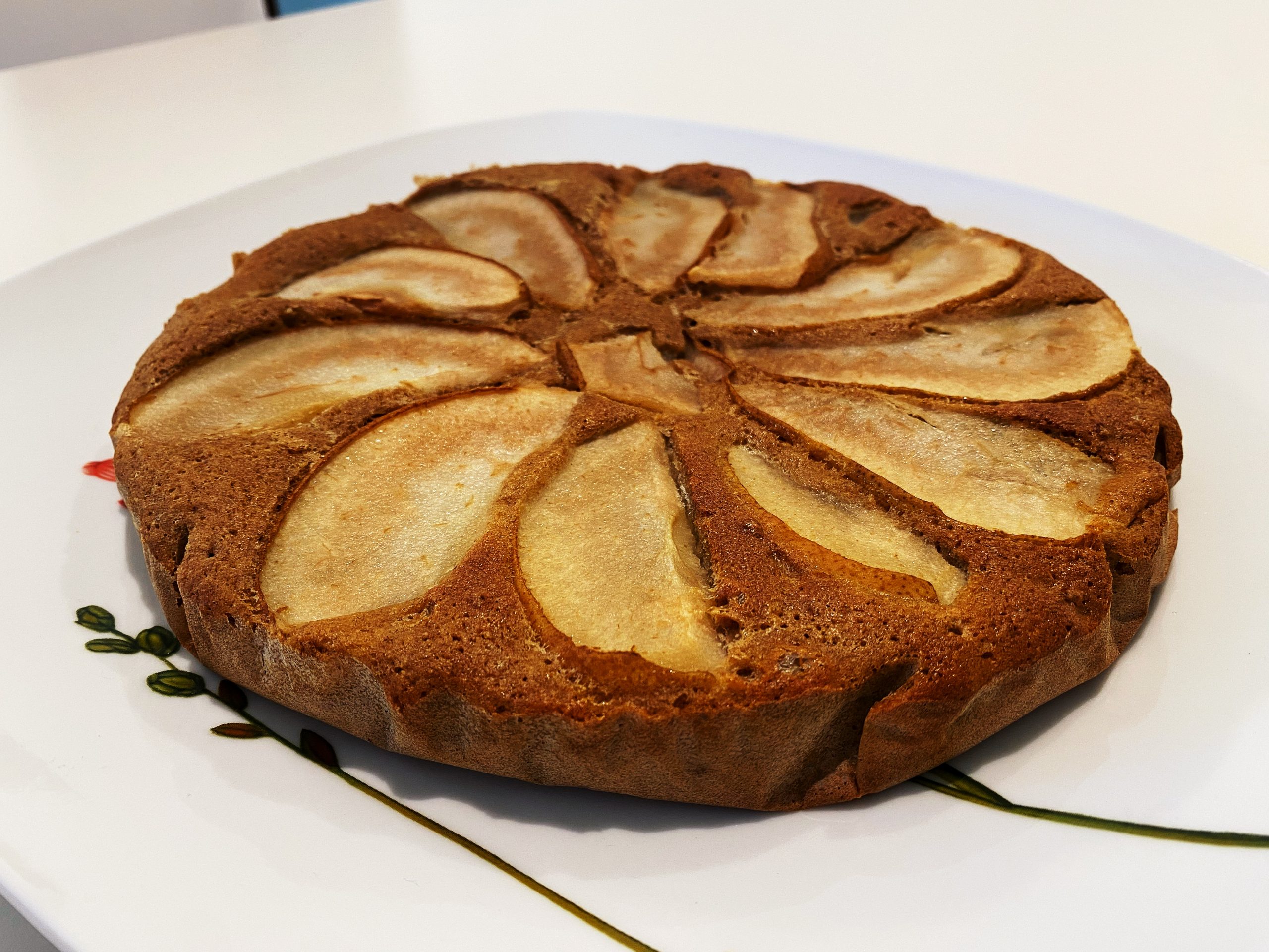 - 5Tagliare a fette sottili l'altra metà di pera e guarnire la torta.